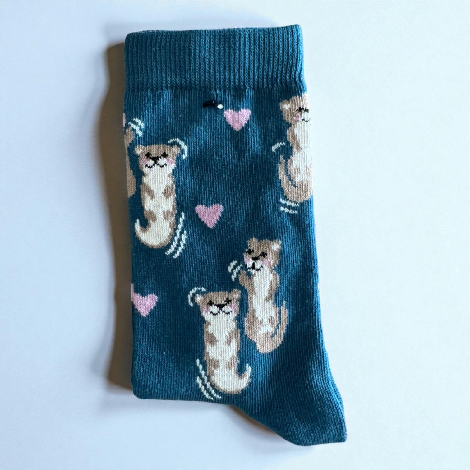 💙 Günlük stilinize sevgi dolu bir dokunuş katacak bu sevimli su samuru çoraplarıyla tanışın! 💖 Koyu petrol mavisi/yeşili zemin üzerine serpiştirilmiş pembe kalpler ve sevimli su samurları, her adımınıza neşe ve tatlılık katacak. ✨ Neden bu çorapları seçmelisiniz?
