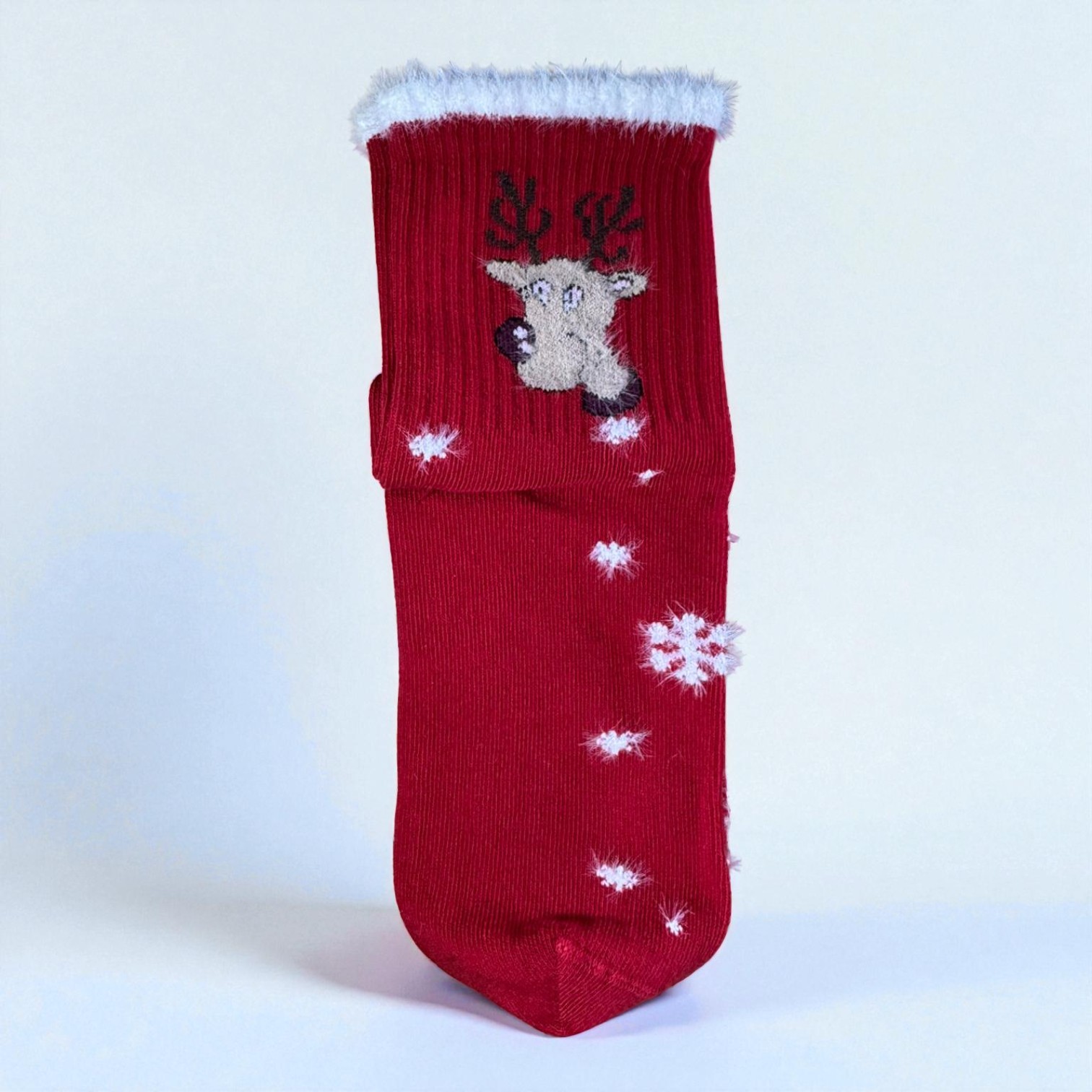 🎄 Kış aylarına ve yılbaşı coşkusuna sıcacık bir dokunuş katacak bu sevimli çoraplarla tanışın! ❤️ Canlı kırmızı zemin üzerinde, sevimli bir ren geyiği, kar taneleri ve bileğindeki pofuduk beyaz tüy detayıyla öne çıkıyor. ✨ Neden bu çorapları seçmelisiniz?