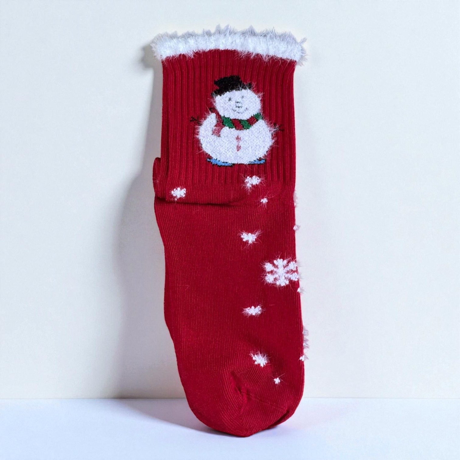 ❄️ Kış mevsiminin ve yılbaşı ruhunun tüm sevimliliğini ayaklarınıza getirecek bu çoraplarla tanışın! ❤️ Canlı kırmızı zemin üzerinde, sevimli bir kardan adam figürü, kar taneleri ve bileğindeki pofuduk beyaz tüy detayıyla öne çıkıyor. ✨ Neden bu çorapları seçmelisiniz?
