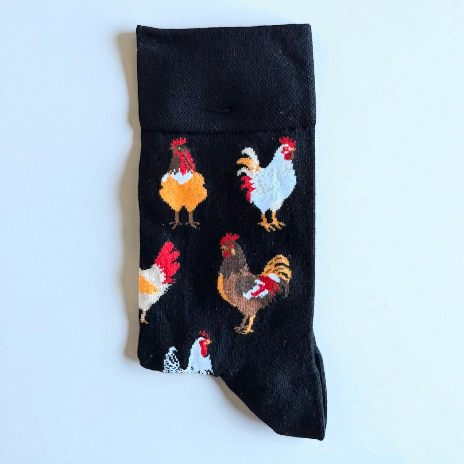 🖤 Günlük stilinize eğlenceli ve kırsal bir dokunuş katacak bu tavuk-horoz desenli çoraplarla tanışın! 🐓 Siyah zemin üzerinde özenle işlenmiş rengarenk tavuk ve horoz figürleri, her adımınıza karakter ve biraz da nostalji katacak. ✨ Neden bu çorapları seçmelisiniz?